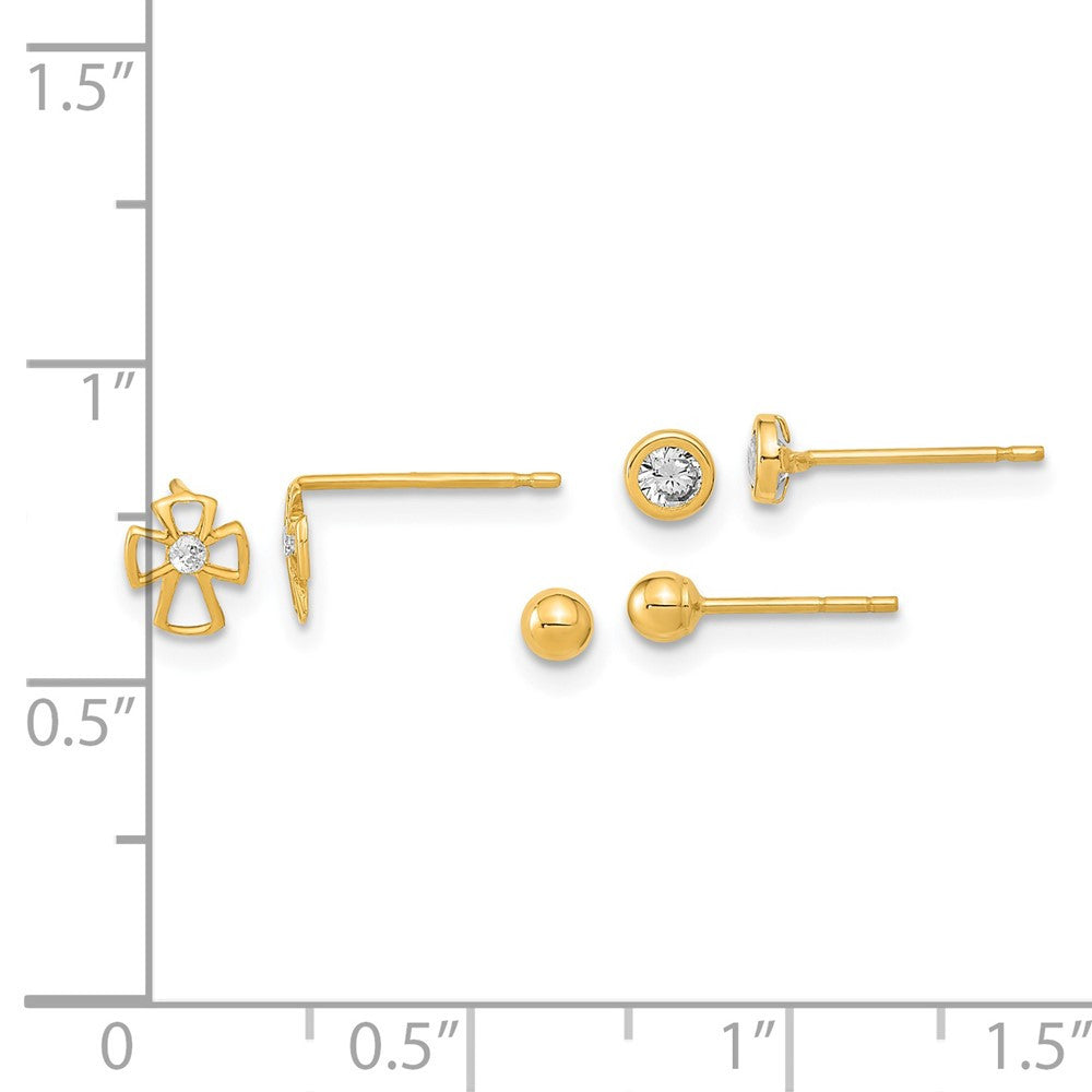 14k Yellow Gold Polished Set of Ball Cross and CZ Stud Earrings 3 Pair Set