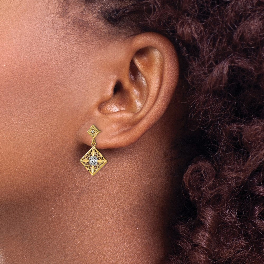 14k Yellow Gold Rhodium Diamond-Cut Square Filigree Dangle Earrings