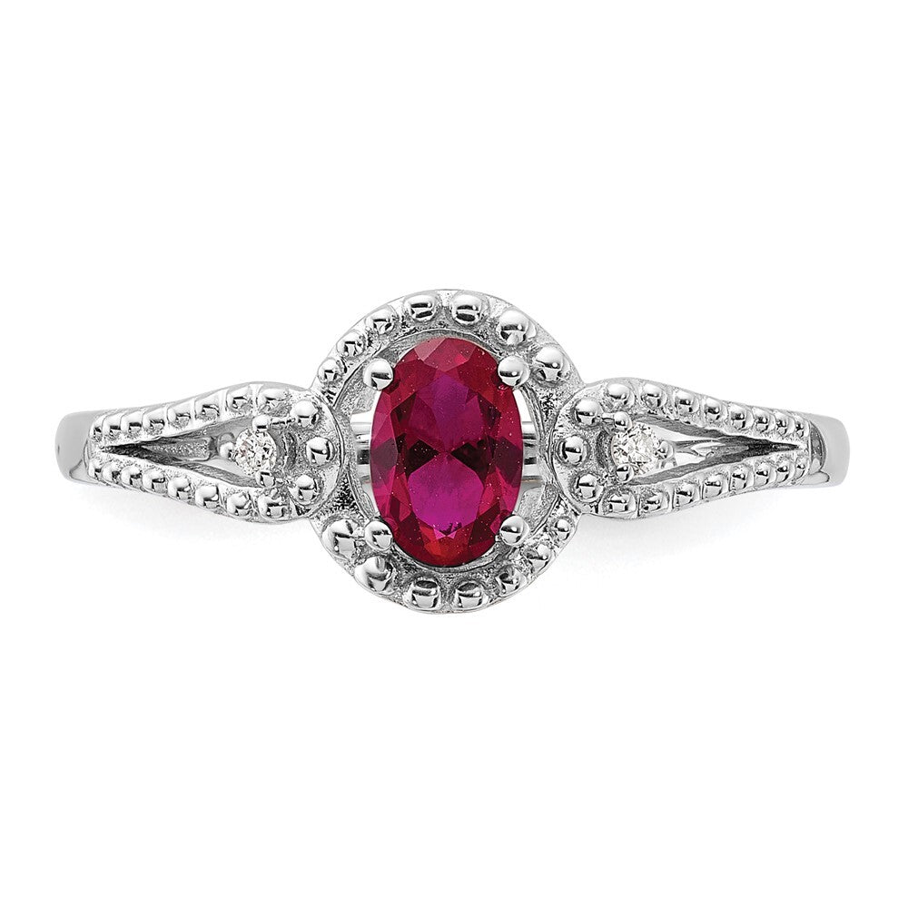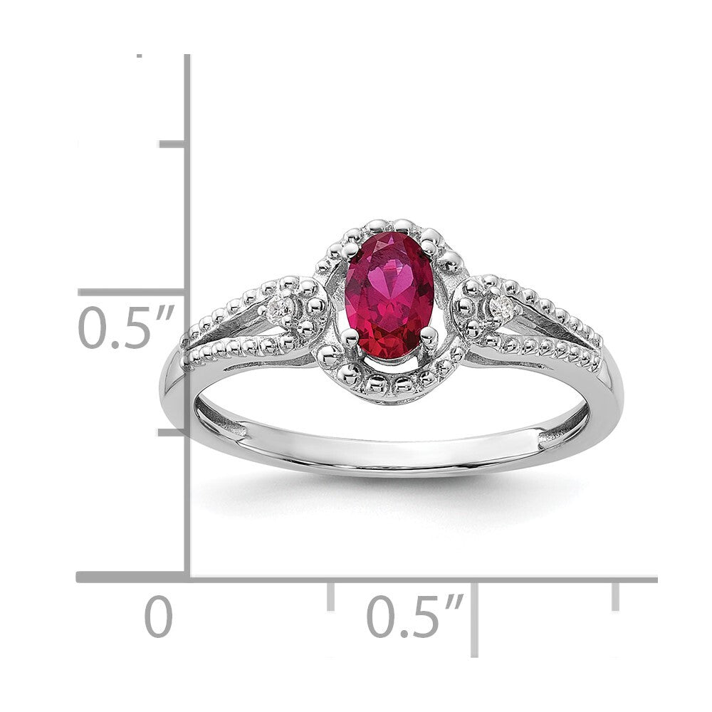 Material: Primary - Purity:925|Stone Type_1:Ruby, Lab Created|Stone Type_2:Diamond|Stone Color_1:Red|Stone Quantity_1:1|Stone Quantity_2:2|Plating:Rhodium|Band Width:2 mm|Stone Setting_1:Prong Set|Stone Setting_2:Prong Set|Stone Weight_1:0.473 ct|Stone Weight_2:0.02 ctw (total weight)|Feature:Solid|Manufacturing Process:Casted|Material: Primary:Sterling Silver|Stone Shape_1:Oval|Stone Shape_2:Round|Stone Size_1:6 x 4 mm|Stone Size_2:1.3 mm|Stone Treatment_1:Synthetic|Item Weight U/M:gm|Product Type:Jewelry|Jewelry Type:Rings|Material: Primary - Color:White|Ring Type:Gemstone|Plating Color:Silver Tone|Stone Creation Method_1:Lab Created|Stone Creation Method_2:Natural|Birthstone Month:(07) July