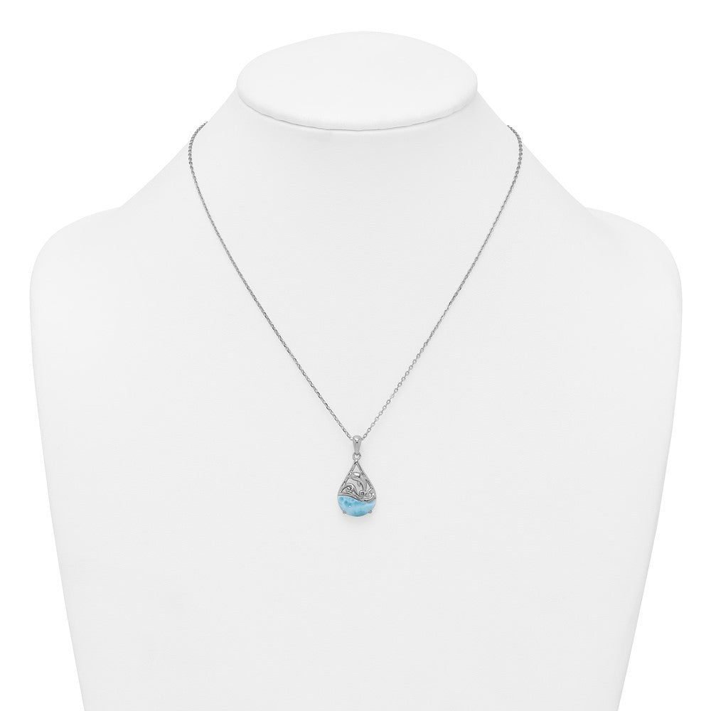 Sterling Silver Rhodium-plated Polished Larimar Dolphin Teardrop Necklace 16+2"